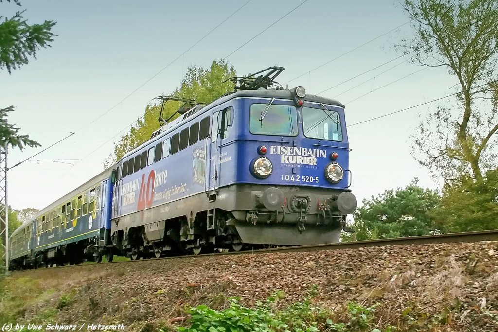 Die Centralbahn 1042 520-5 zog am 01.10.2009 den Sonderzug "Eurostrand" nach Leiwen, hier kurz vorm Bahnhof Hetzerath