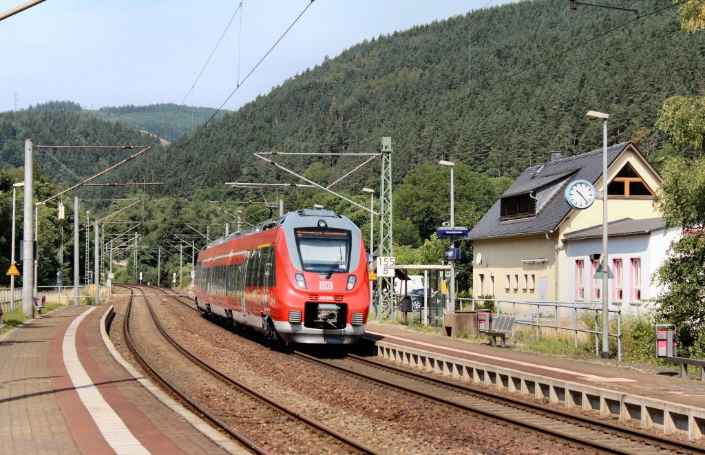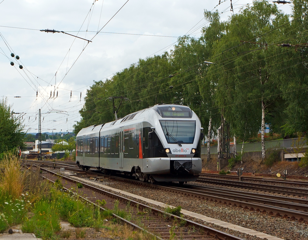 ET 22002 der Abellio Rail NRW fährt am 10.08.2013 als RB 91 (Ruhr-Sieg-Bahn) die Verbindung Hagen-Siegen auf der KBS 440 (Ruhr-Sieg-Strecke), hier kurz hinter dem Bahnhof Kreuztal.