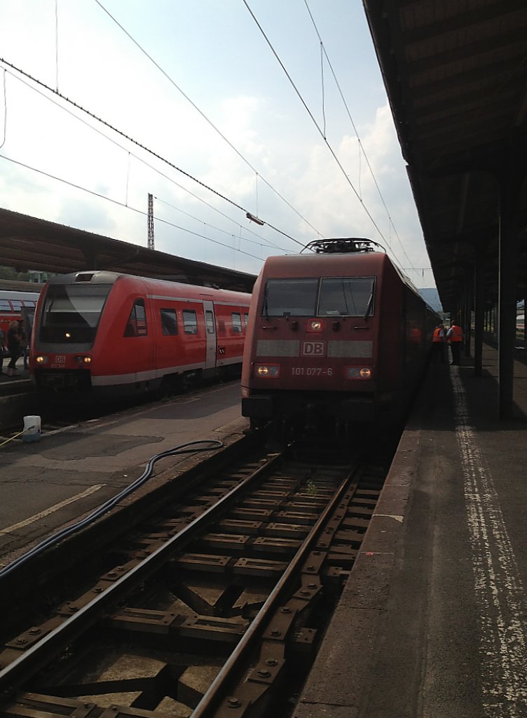 Hier steht 101 077 neben einem unbekannt gebliebenen 612er am 9.8.13 in Kassel Hbf.