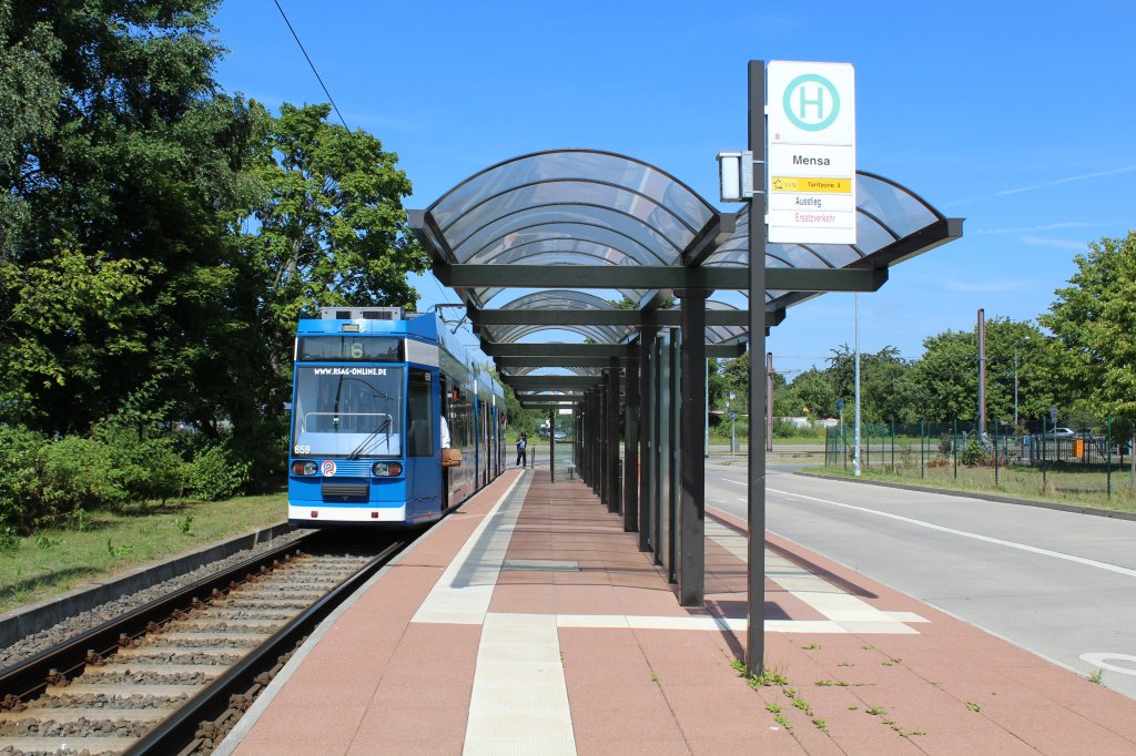 Rostock RSAG SL 6 (Düwag/DWA-6NGTWDE 659) Südstadt, Südring, Endstelle Mensa (Ausstieg) am 16. Juli 2013.