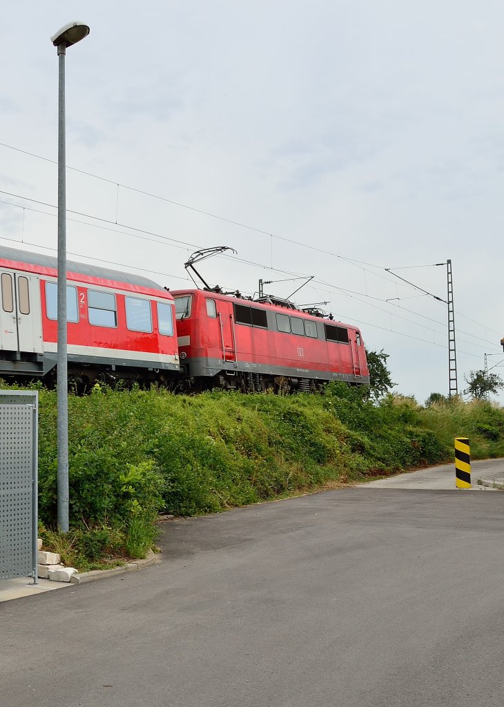 Wegen Lokmangels im Werk Freiburg, bespannte die Freiburger 143 050-3 einen RE von Offenburg nach Basel Bad Bf. Hier ist der Zug am 25.06.2013 in der Südlichen Kurve von Schallstadt und beschleunigt aus dem gleichnamigen Bahnhof gen Süden.