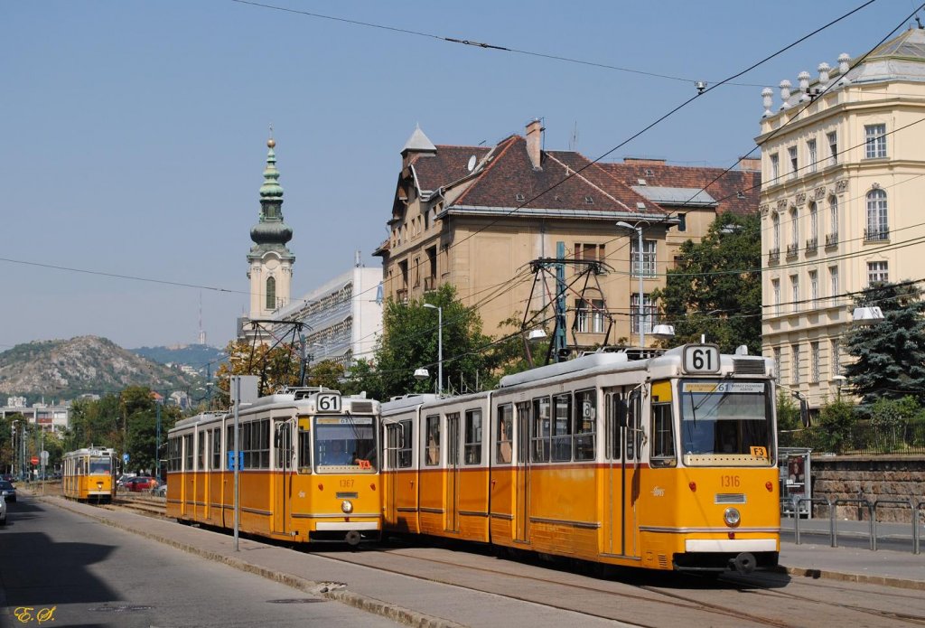 Wegen Gleisbauarbeiten zwischen Szell Kalman ter und Deli palyaudvar mußte die Linie 61 geteilt geführt werden.Während im nördlichen Streckenteil wie gewohnt CKD-T5C5-Garnituren fuhren,kamen im südlichen Abschnitt ausnahmsweise Gelenkwagen der Type CSMG zum Einsatz.Hier sehen wir drei dieser Triebwagen in der Endstelle am Moritz Zsigmond körter.(08.08.2013)