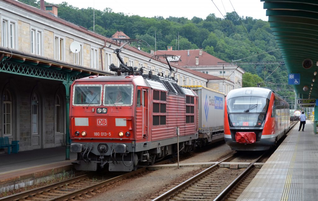 180 013 erreichte am 04.07.13 mit einem Zug des kombinierten Verkehrs Decin. Nach kurzem Halt setzte sie ihre Fahrt mit beiden Stromabnehmern am Draht Richtung Tschechien fort.