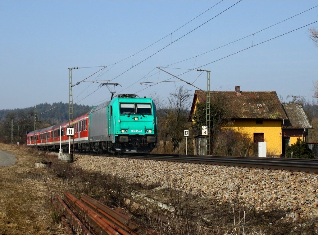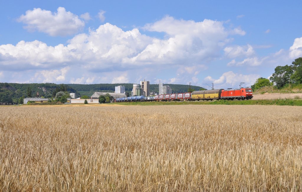 185 013 mit einem gem.GZ Richtung Süden auf der Main-Spessart-Bahn.Aufgenommen bei Karlstadt am Main am 10.8.2013
