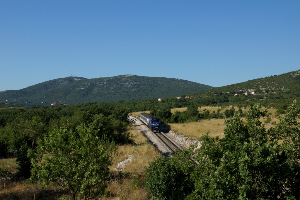 Zweimal pro Woche verbindet das "Adria" Zugpaar Split und Budapest. Am 24.07.2013 hat Zug 1205, geführt von 2044 023, die Bucht von Split schon bald verlassen und windet sich bei Sadine weiter ins Landesinnere.