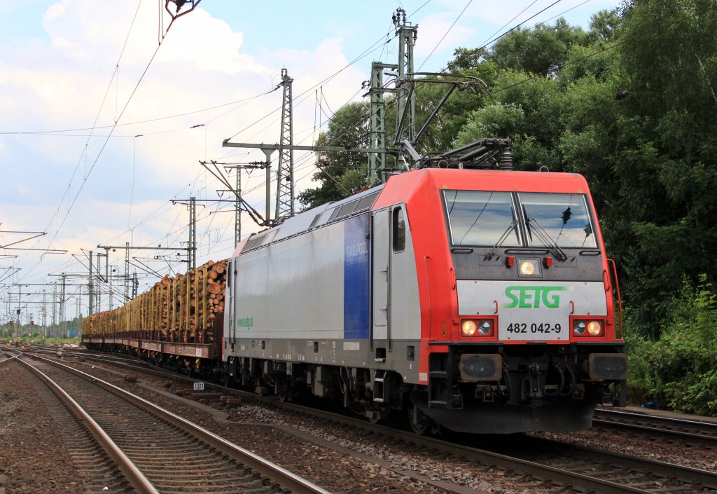482 042-0 mit einem Holzzug am 31. Juli 2013 in HH-Harburg.
