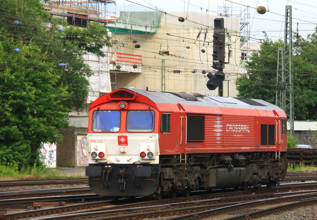 Ein Nachschuss von der Class 66 PB03 "Mireille" von Crossrail fährt als Lokzug aus Aachen-West und fährt nach Montzen-Gare(B) bei der Abendsonne und Wolken am Abend vom 1.7.2013.