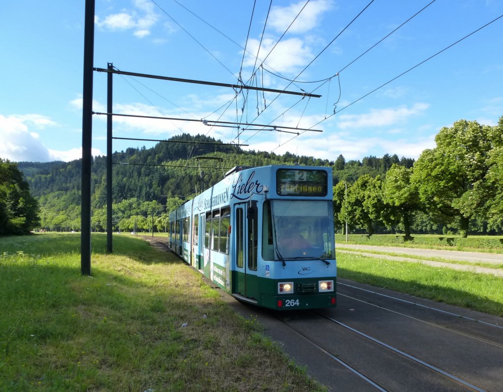 Bei der Begegung am 12.08.2013 mit SWE 72519 hinter dem Friedhof von Staufen traute sich die Sonne nicht so recht und schien deswegen nur schwach auf die Front des Tw 508 der SWEG, der auf dem Weg nach Münstertal (Schwarzwald) war.