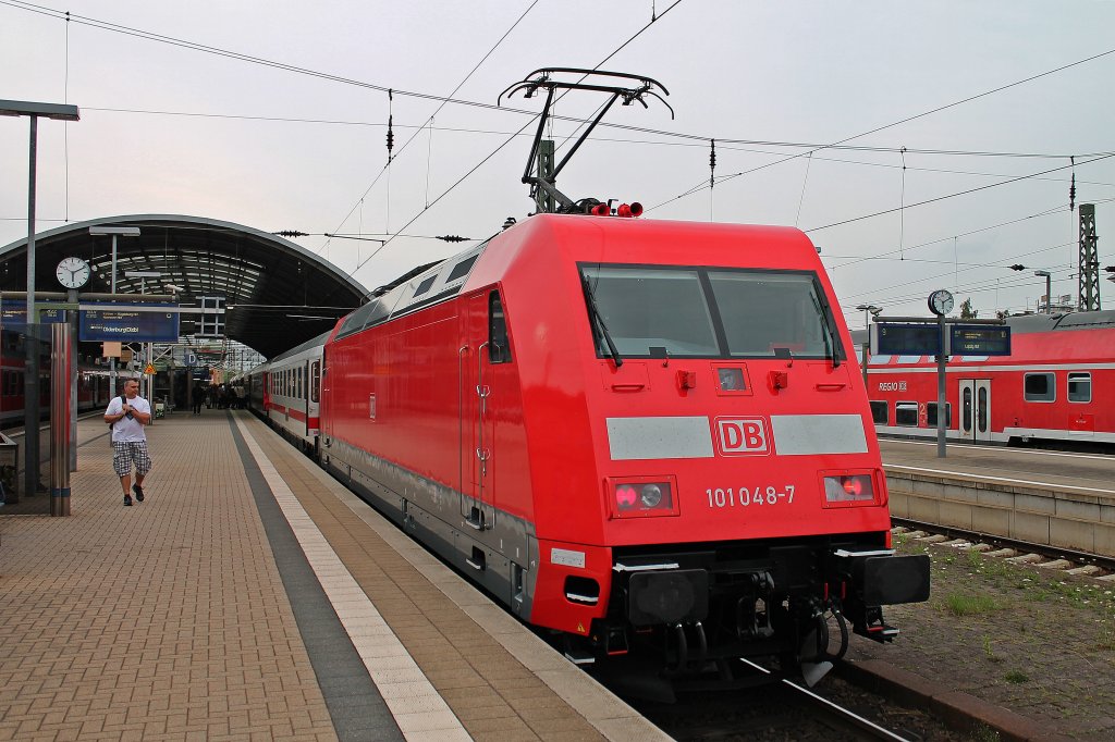 IC 2032 (Dresden Hbf - Oldenburg) am 09.08.2013 mit der frisch revidirten 101 048-7 (HU 05.08.2013) im Hauptbahnhof von Halle (Saale).