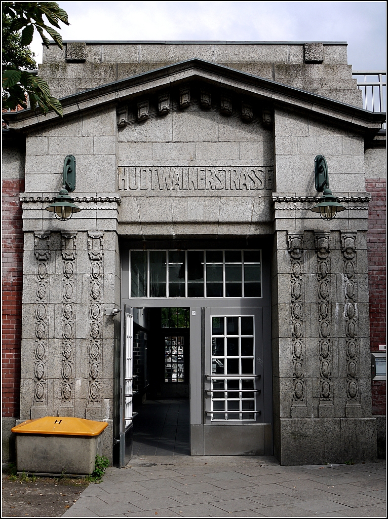 Mehr als hundert Jahre alt - und komplett erhalten: das Eingangsportal zur Hamburger U-Bahnstation "Hudwalckerstraße", von den Steinmetzen damals fälschlicherweise ohne C gemeisselt... Schön wäre es auch, wenn die HHA mal den hässlichen Streusandbehälter zur Seite räumen würde! 11.8.2013