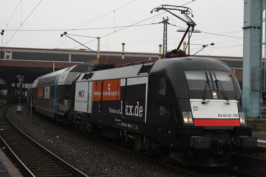MRCE Dispolok/HKX ES 64 U2-026 zieht am 3.3.13 einen HKX nach Hamburg aus dem Düsseldorfer Hbf.