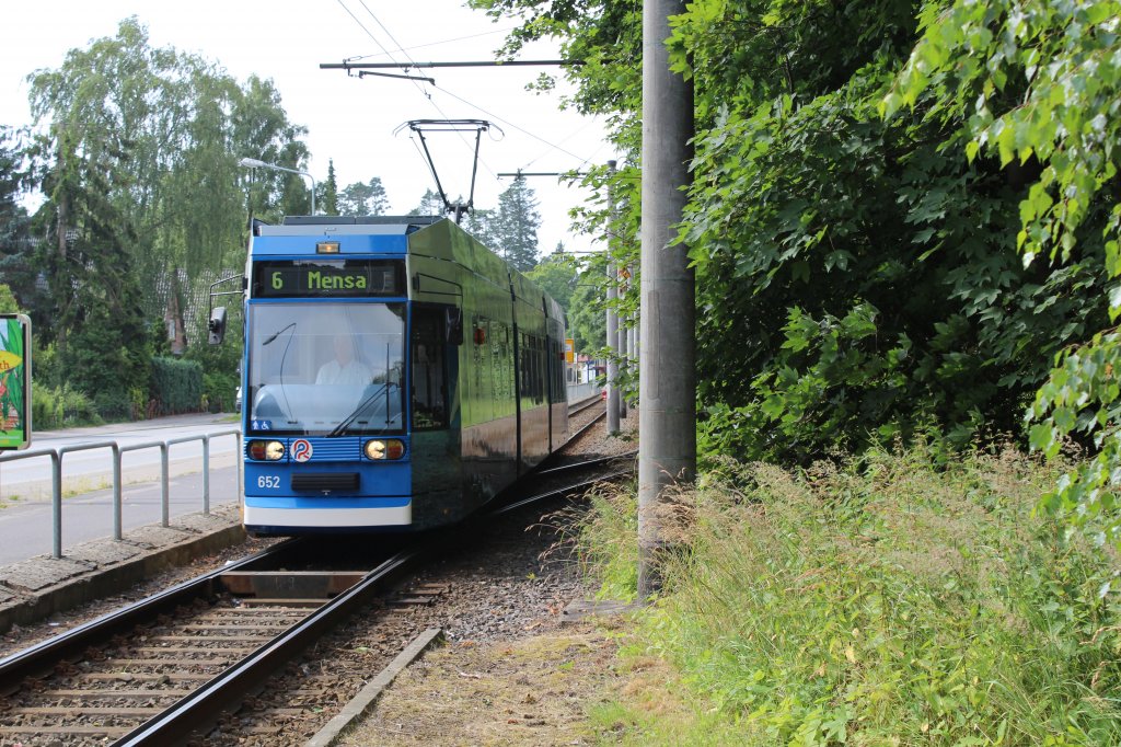 Rostock RSAG SL 6 (Düwag/DWA-6NGTWDE 652) Rennbahnallee / Tannenweg am 19. Juli 2013.