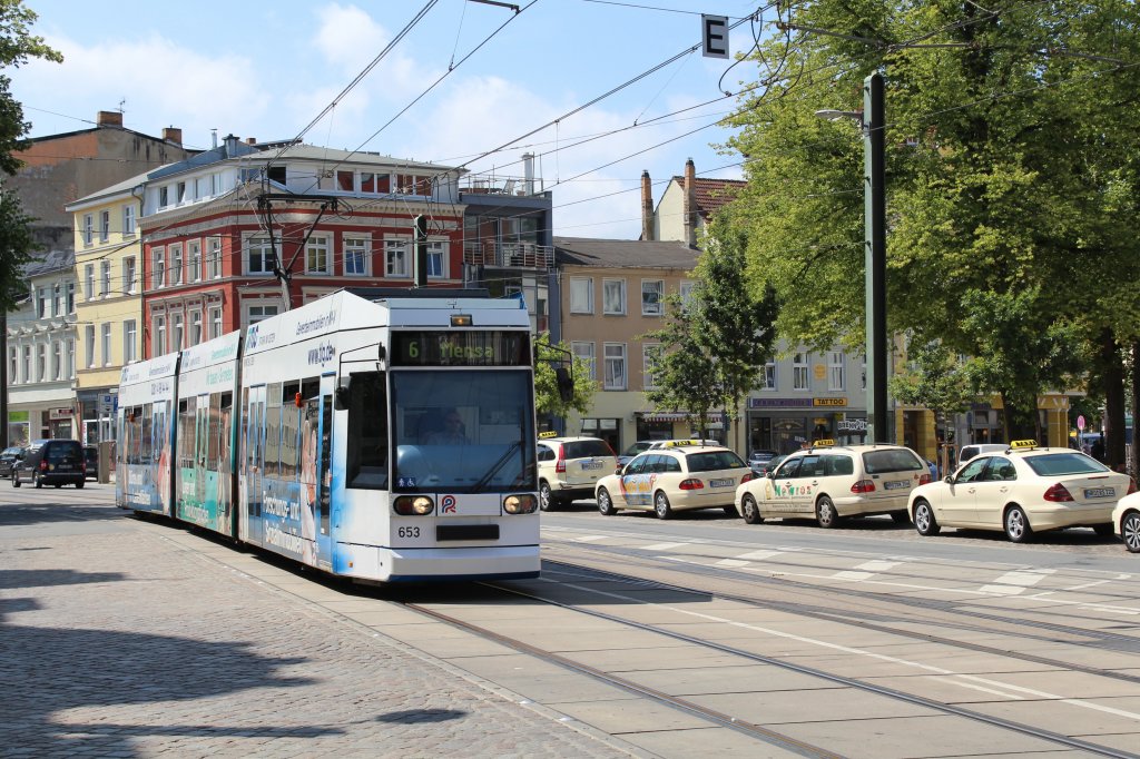 Rostock RSAG SL 6 (Düwag/DWA-6NGTWDE 653) Wismarsche Strasse / Doberaner Platz am 16. Juli 2013.