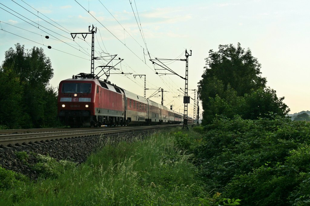 120 105-2 mit dem CNL/Az 1379 von Hamburg-Altona nach Lörrach am Morgen des 25.07.13 im Einfahrbereich des Bahnhofs Müllheim (Baden).