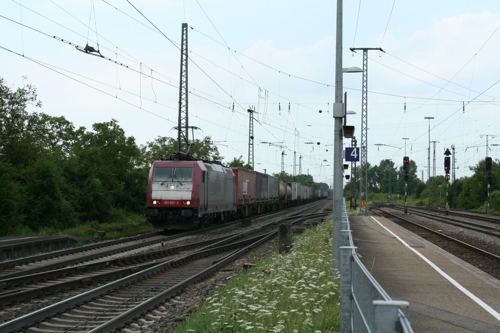 185 601-2 mit einem KLV-Zug gen Norden am Morgen des 25.07.13 bei der Durchfahrt des südbadischen Kleinstädtchens Müllheim (Baden).