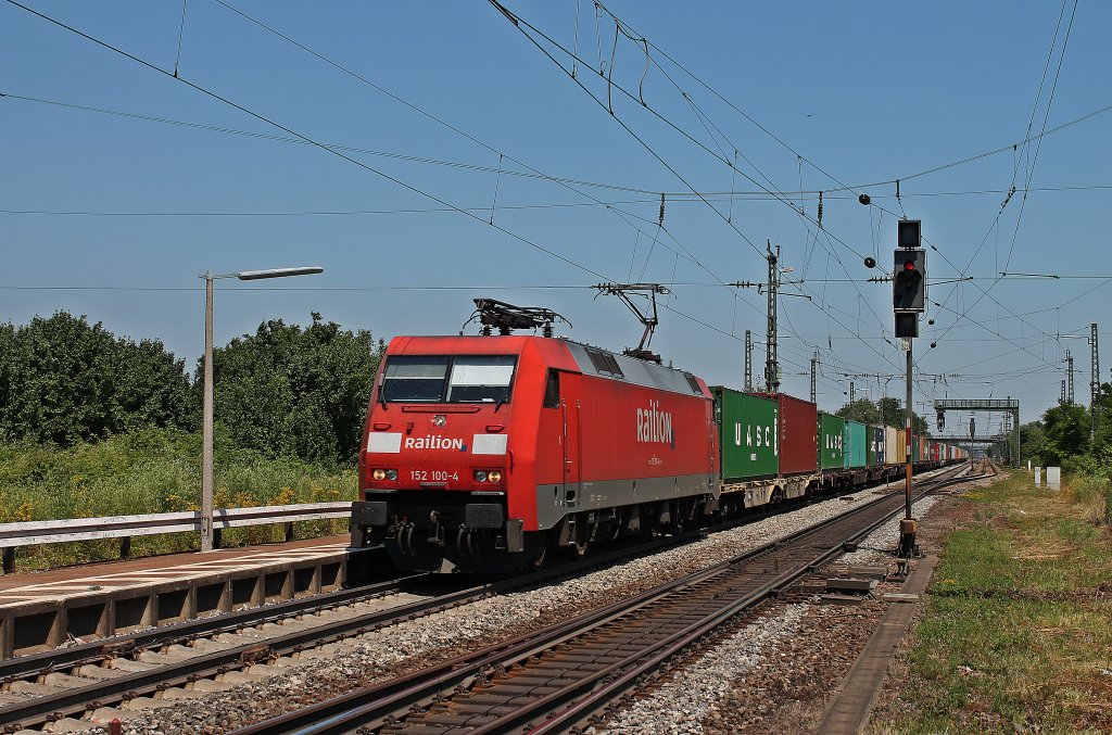 Bahnhof Orschweier auf der KBS 703 am 08.07.2013. 152 100-4 mit einem Containerzug bei der Durchfahrt von Orschweier gen Süden.