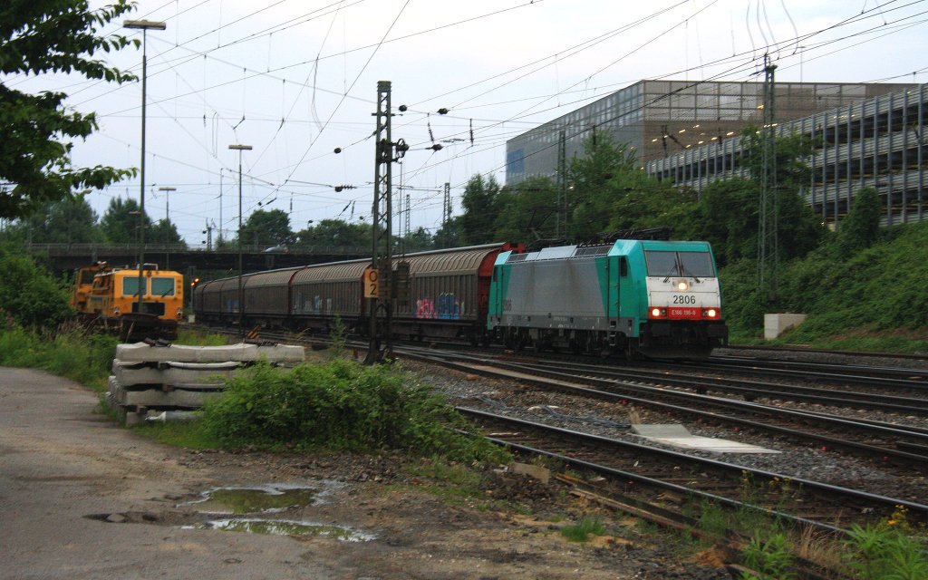 Die Cobra 2806 kommt aus Richtung Montzen/Belgien mit einem langen Papierleerzug aus Zeebrugge(B) nach Köln-Gremberg und fährt in Aachen-West ein und auf dem Nebengleis steht eine Stopfmaschine und ein Schotterprofiliermaschine steht auf dem abstellgleis in Aachen-West in der Abendstimmung und Wolken am Abend vom 4.7.2013.