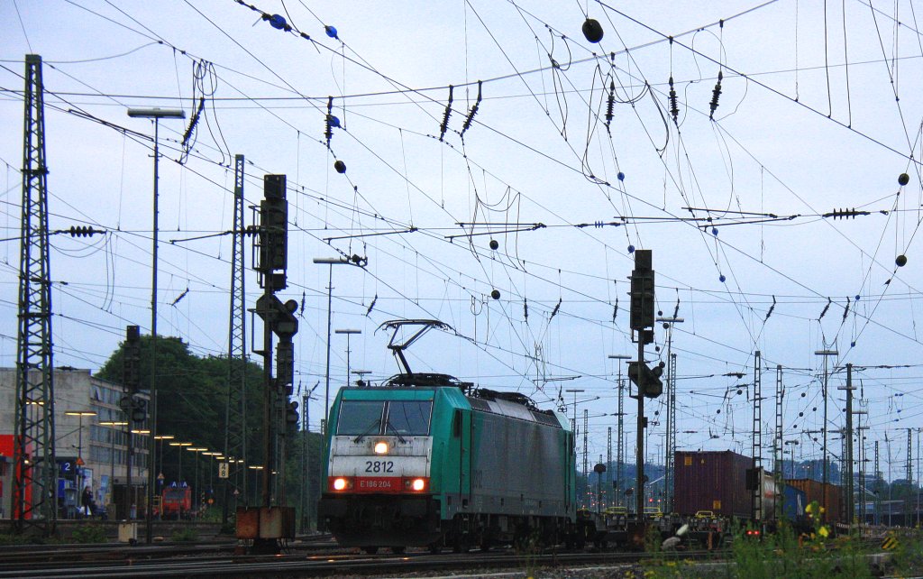 Die Cobra 2812 fährt mit einem langen Containerzug aus Gallarate(I) nach Zeebrugge(B) bei der Ausfahrt aus Aachen-West und fährt in Richtung Montzen/Belgien in der Abendstimmung und Wolken am Abend vom 4.7.2013.