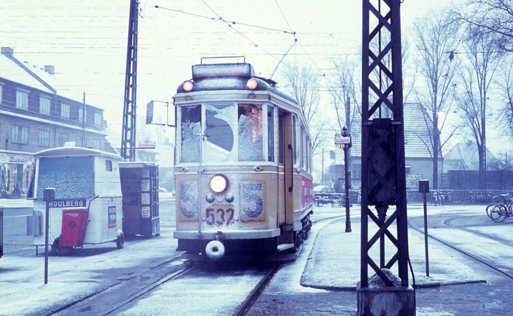 København / Kopenhagen KS SL 7 (KS-Grossraumtriebwagen 519) Brønshøj Torv im Dezember 1968.