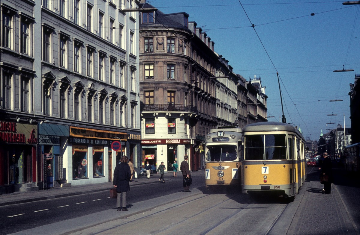 København / Kopenhagen KS SL 7 (DÜWAG-GT6 874 / 858) Frederiksborggade / Nørre Farimagsgade am 23. April 1971.