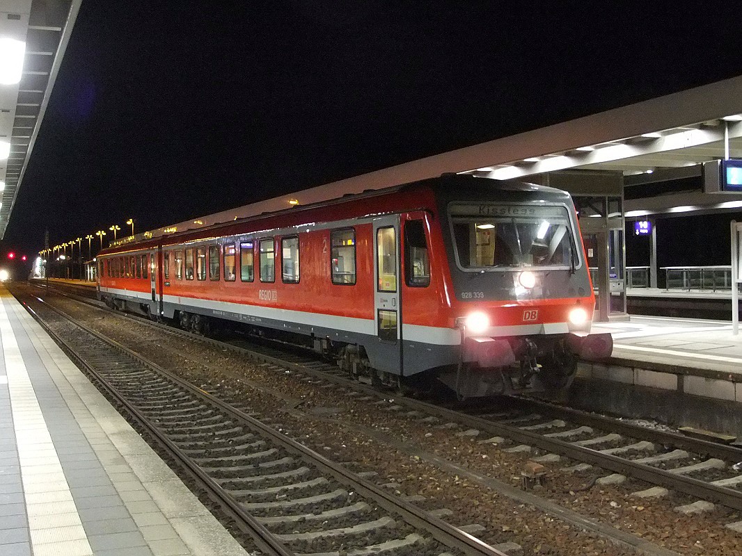 Nachdem 628 339 am 12.08.2013 um 22.47 als RB von Ulm in Memmingen ankam, wird er um 23.05 Uhr die Fahrt nach Kisslegg fortsetzen.
