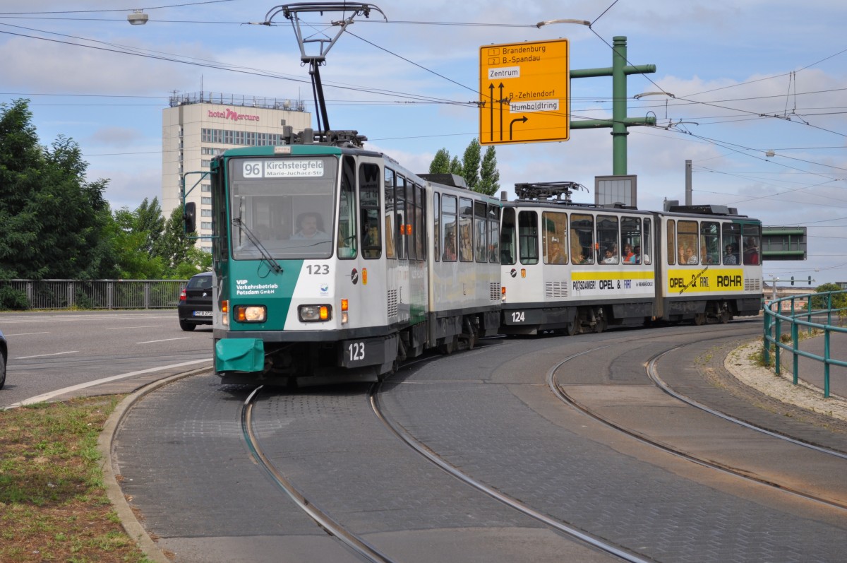 Tatra 123 mit 124 auf der Linie 96 zum Kichsteigfeld am Potsdamer Hauptbahnhof. Aufgenommen am 10.08.2013