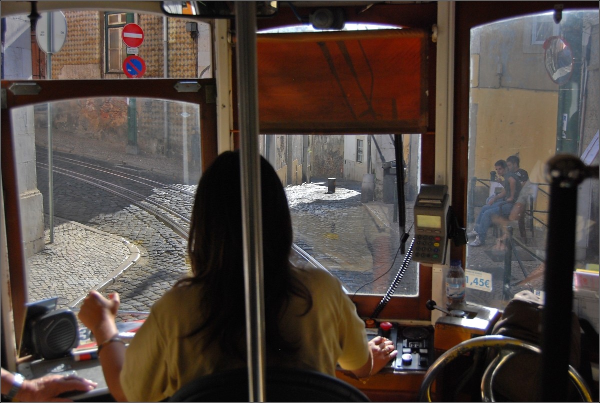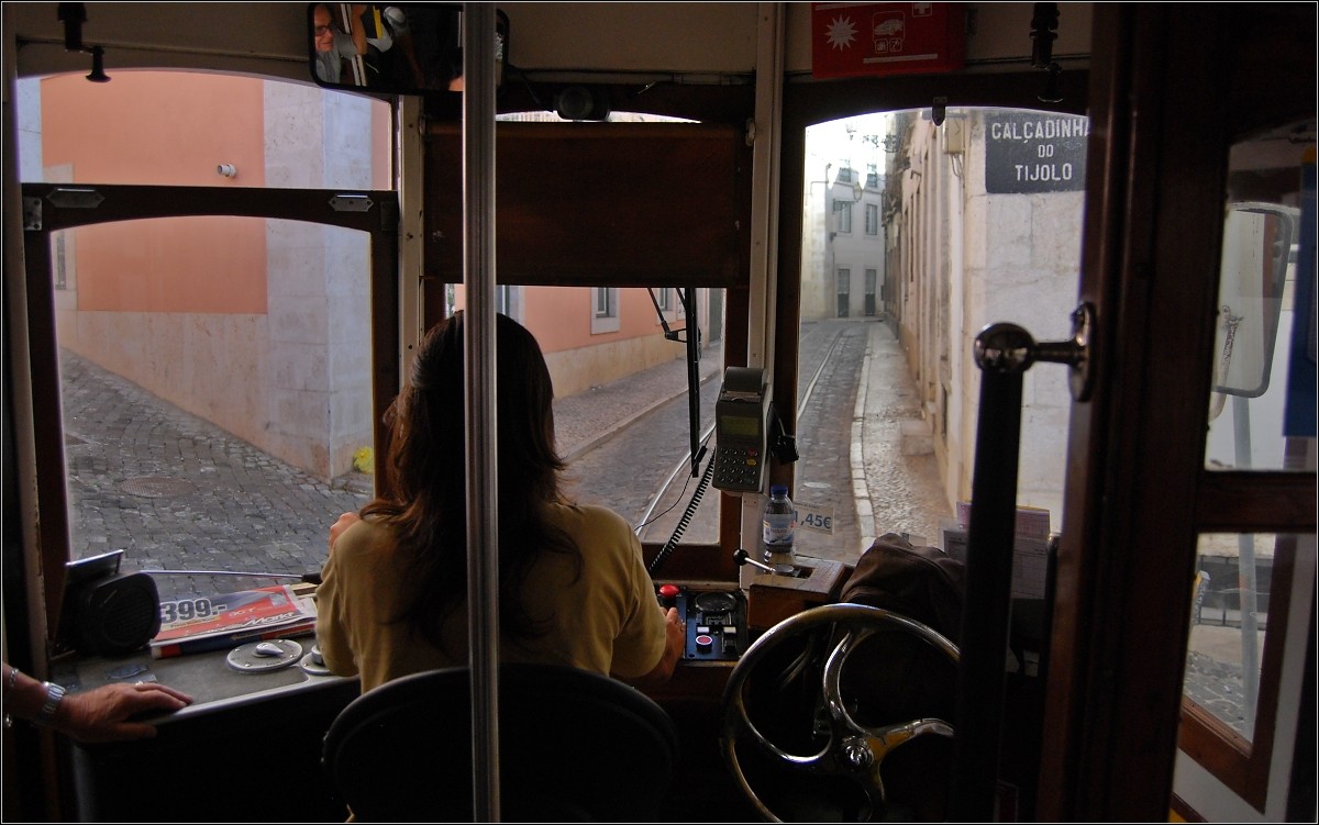 Ab dem Tijologässchen bis zur nächsten Ecke der Rua das Escolas Gerais gibt es gar keinen Platz, drum wird ein Gleis in beide Richtungen befahren. Im hinteren Teil müssen sogar Fußgänger Platz machen, wenn die Straßenbahn sich um die Ecken drückt. Alfama, Lissabon im September 2010.