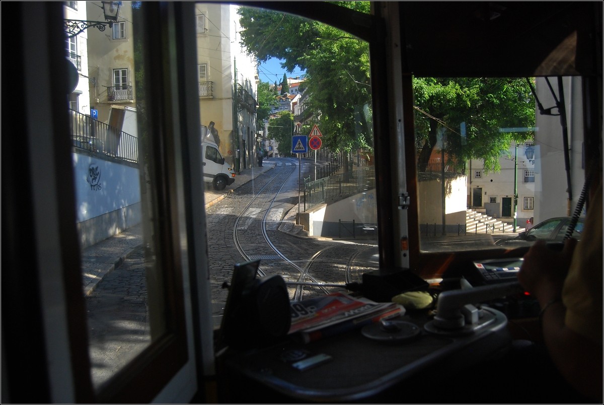 Statt steil nach unten geht es steil nach rechts oben... hoffentlich... Weil kein Platz ist sind hier die Gleise verschwenkt. Alfama, Lissabon im September 2010.