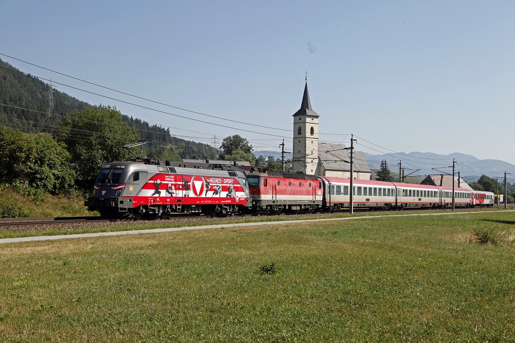 1116 138 und 1144.225 ziehen am 16.08.2013 Intercity 514 in Kammern Richtung Selzthal.