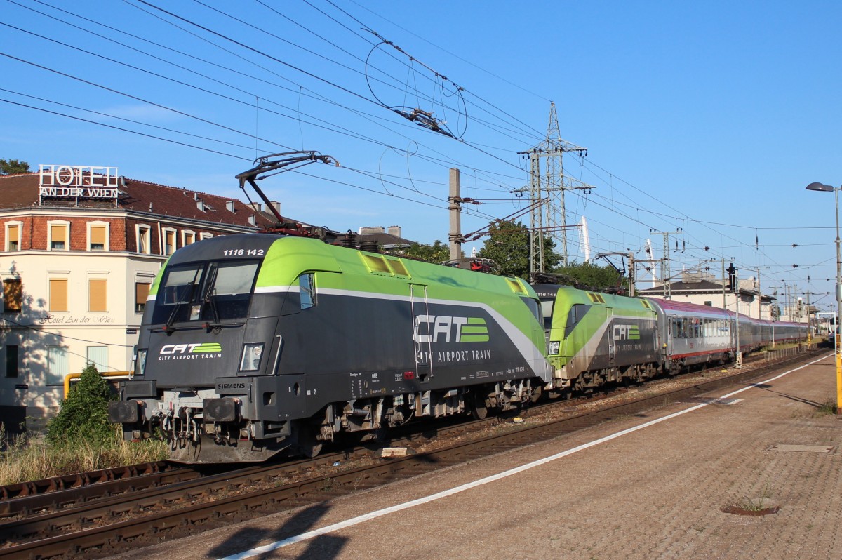 1116 142 mit 1116 141 vor dem Hotel an der Wien und dem REX 1946 "REX 200" von Wien Westbahnhof (Ws) nach Sankt Valentin (Sv), hier zum sehen bei der Ausfahrt in Wien Hütteldorf (Hf); am 16.08.2013