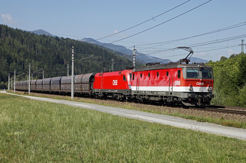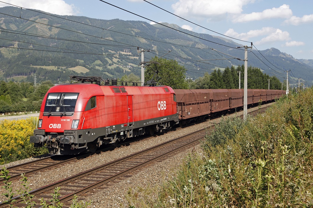 1116 195 ist am 16.08.2013 mit einem Erzug zwischen Gaishorn und Trieben unterwegs.