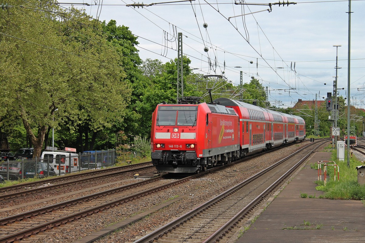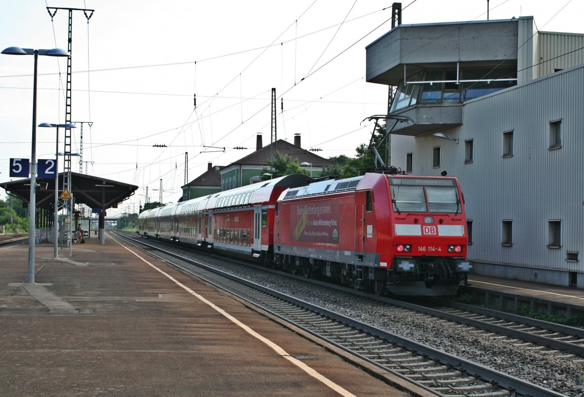 146 114-4 mit einem RE nach Offenburg am Morgen des 25.07.13 bei der Einfahrt in den Bahnhofs Müllheim (Baden).