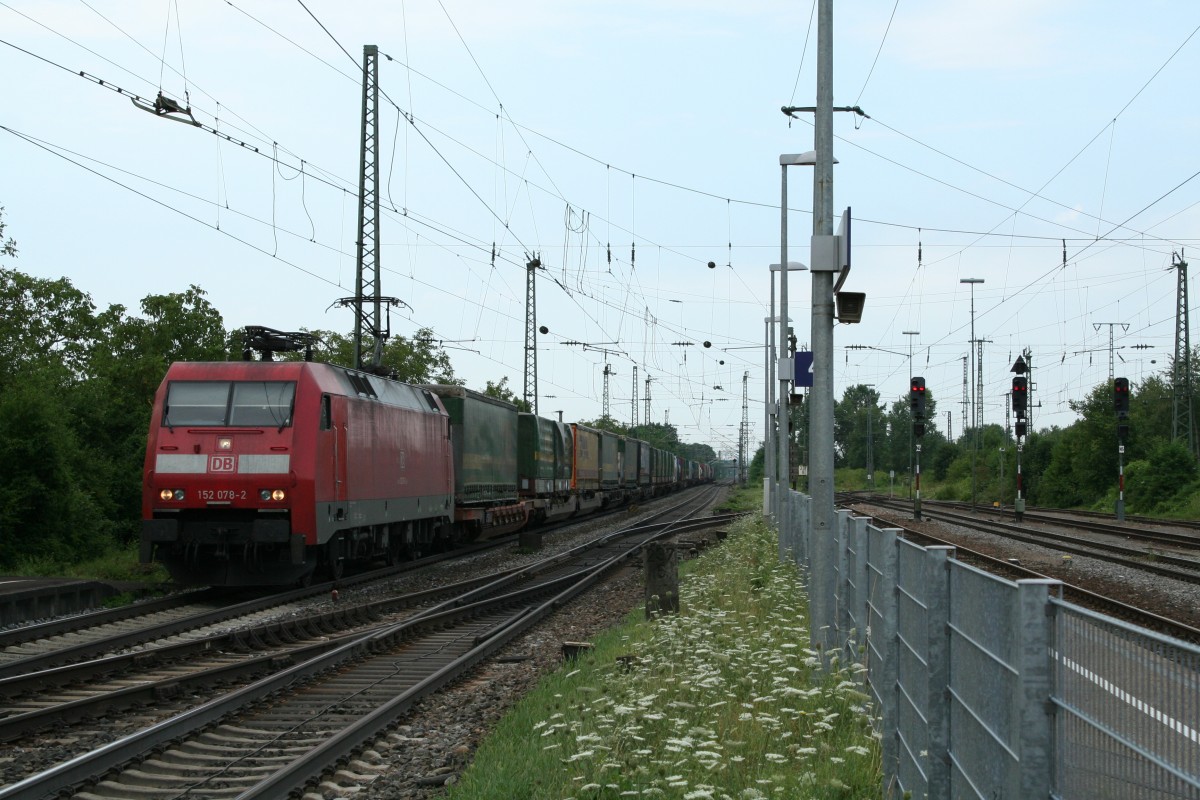 152 078-2 mit einem KLV-Zug gen Norden am Morgen des 25.07.13 bei der Durchfahrt des Bahnhofs Müllheim (Baden.)