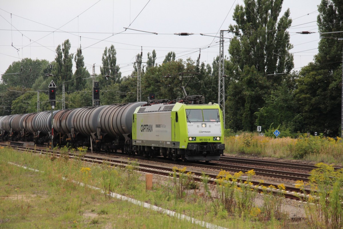 17.8.2013 Bernau bei Berlin. 185 532 von Captrain mit Kesselzug Richtung Angermünde / Stendell.