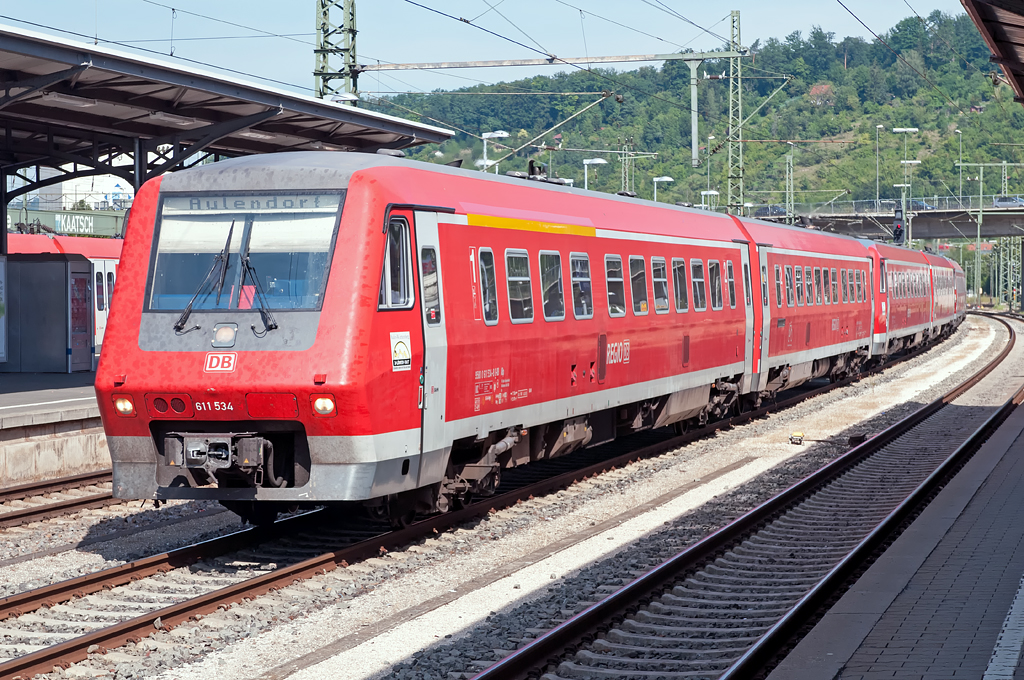 611 534-8 ( 95 80 0611 534-8 D-DB ), ADtranz 22055, Baujahr 1997, Eigentümer: DB Regio AG, Fahrzeugnutzer: DB ZugBus Regionalverkehr Alb-Bodensee GmbH, Bh Ulm, Erst-Bw Kaiserslautern, 17.08.2013, Plochingen Bf