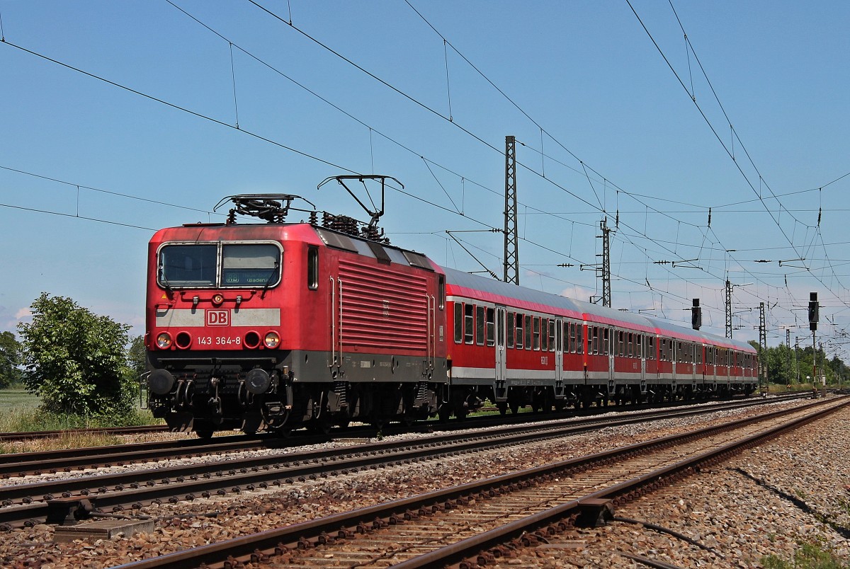 Am Mittag des 13.06.2013 bespannte die Freiburger 143 364-8 eine RB, bestehend aus n-Wagen, von Offenburg nach Neuenburg (Baden). Hier ist die RegionalBahn bei der Einfahrt in den bahnhof von Orschweier.