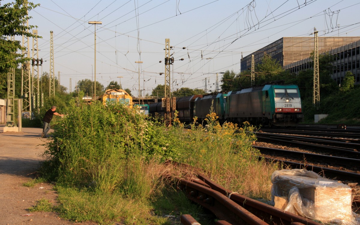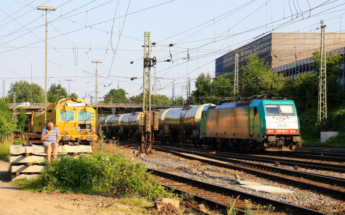 Die Cobra 2806 kommt aus Richtung Montzen/Belgien mit einem langen Kesselzug aus Antwerpen-Noord(B) nach Burghausen(D) und fährt in Aachen-West ein und fährt in Aachen-West ein, und auf dem Nebengleis steht eine Stopfmaschine und ein Schotterprofiliermaschine steht auf dem abstellgleis in Aachen-West in Abendsonne am Abend vom 8.7.2013.