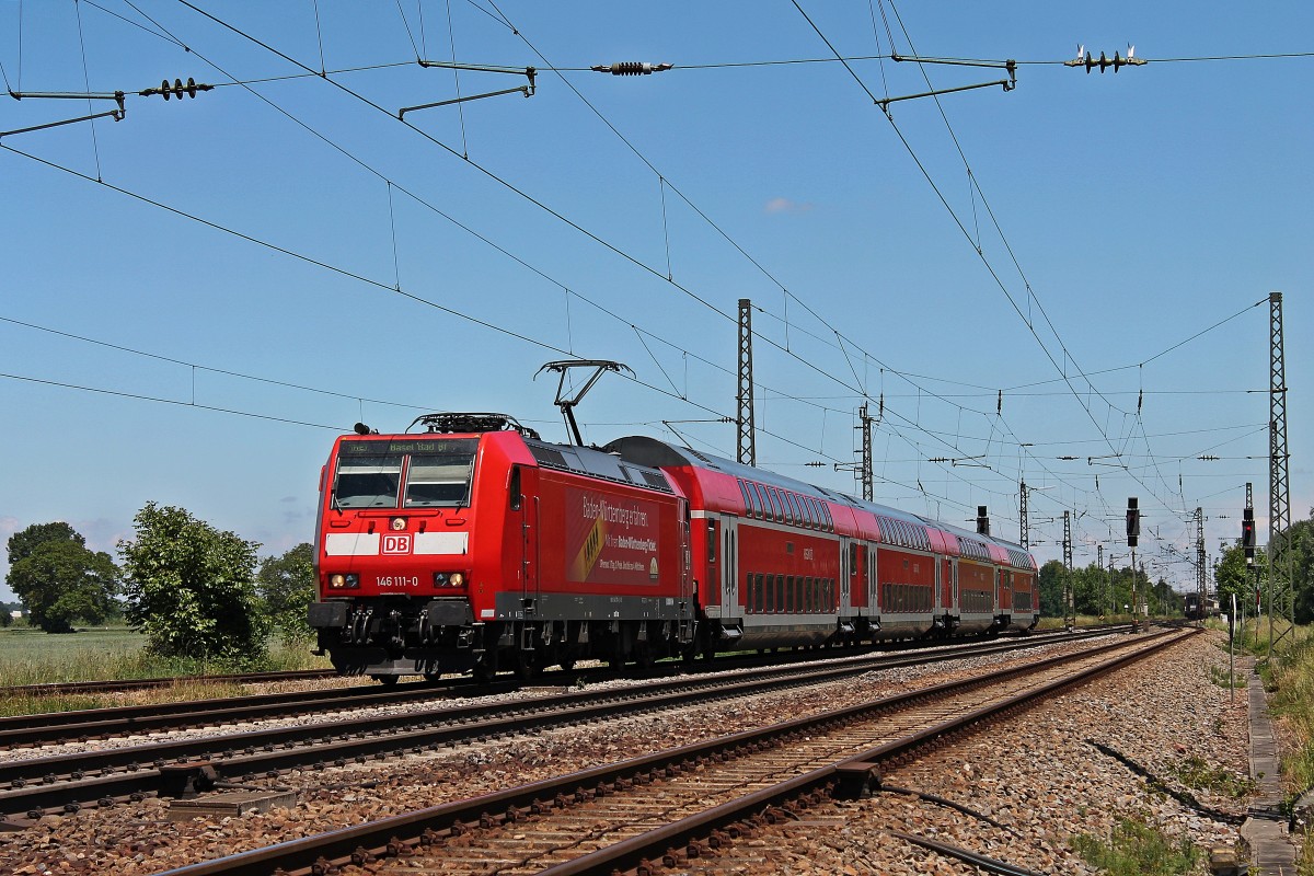 146 111-0 mit einem RE nach Offenburg am Vormittag des 25.07.13 bei der Einfahrt in den Bahnhofs Müllheim (Baden).