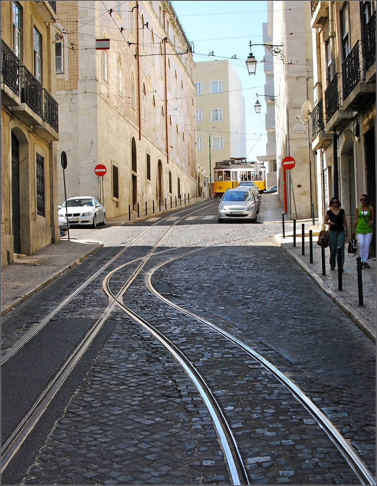 Die entgegenkommende Tram muss warten, denn an dieser Ecke ist eine Gleisverschwenkung nötig um die Kurve zu kratzen. Alfama, Lissabon im September 2010.