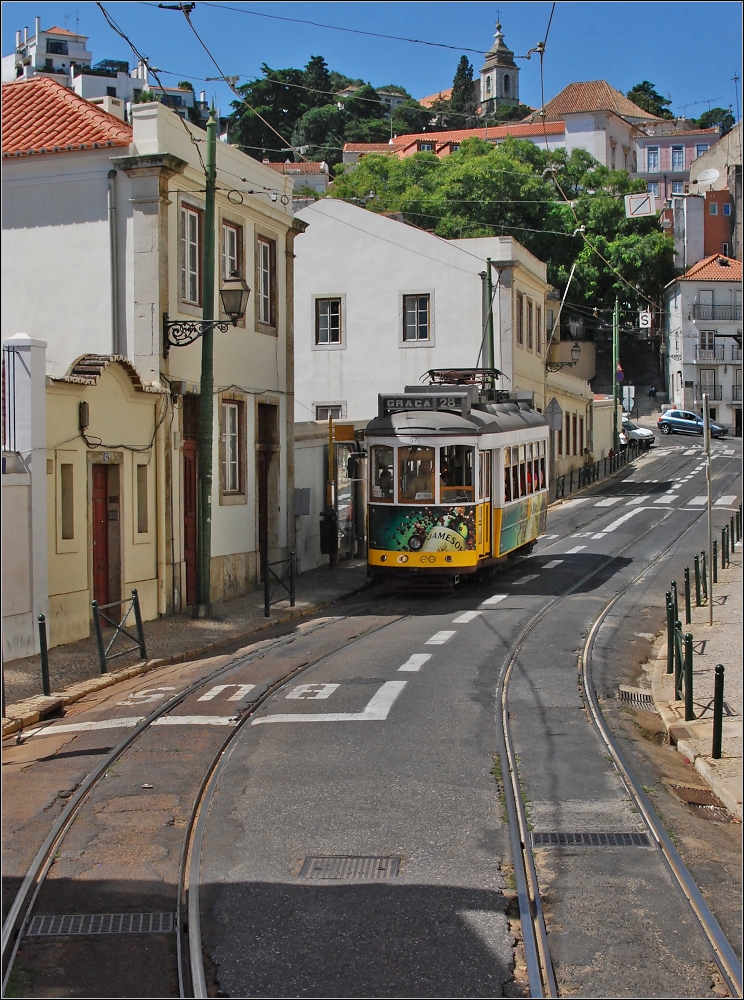 Hier geht es schon steil bergab hinein in die Altstadt, ein paar Meter weiter wird es allerdings noch steiler. Die Fahrgäste betrachten die Kirche Sao Vincente da Fora in meinem Rücken. Deren riesige hellgraue Front taucht die Straßenbahn in ein angenehmes Abendlicht. Alfama, Lissabon im September 2010.