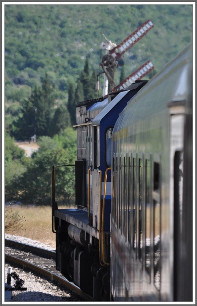 Am 26.07.2013 wurde der im Vorortverkehr nach Ka¨tel Stari eingesetzte Triebwagen 7122 010 untauglich. Als Ersatz wurde zu Mittag mit etwas Verspätung wurde ein Ersatzzug mit der neulackierten 2044 017, die sonst nur durch Anwesenheit im Depot Solin aufgefallen ist, in Verkehr gesetzt. Die Rückfahrt am P 8405 wurde beim Einfahrsignal des Bahnhofs Ka¨tel Sućurac festgehalten.