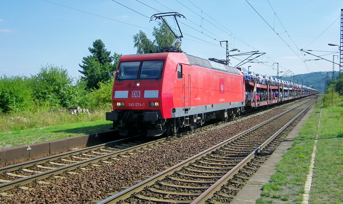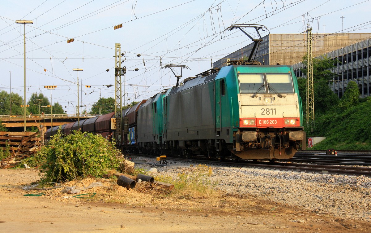 Hier 185 186-4 und die Wagenlok 185 218-5 mit einem Autotransportzug, bei der Durchfahrt am 7.7.2013 durch Berlin Schönefeld Flughafen.