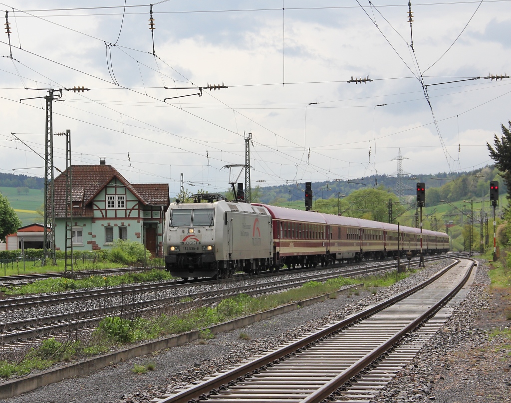 E37 519 von CB Rail zieht am 25. August 2013 einen H-Wagenzug (Wiegandzug) durch Probstzella in Richtung Saalfeld.