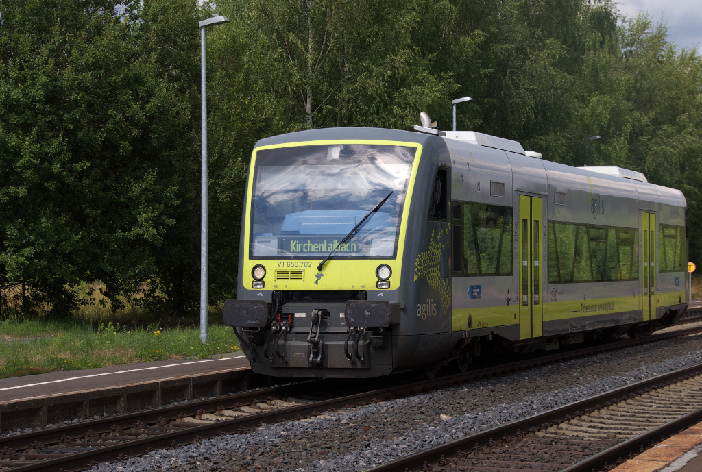 Ein Abstecher ins Fichtelgebirge - Zwei Jahre lang habe ich etwa 500 Meter Luftlinie vom Bahnhof Wunsiedel-Holenbrunn (ehemals Holenbrunn) gewohnt. Leider habe ich keine Dokumente aus dieser Zeit, denn als junge Mutter hat man andere Prioritäten als dass man Eisenbahnen fotografiert. Der ehemalige Bahnknoten hat wie viele Bahnhöfe viel von seiner Bedeutung eingebüßt. Ungefähr 10 Gleise müßte der Bahnhof zu seinen Glanzzeiten gehabt haben. Holenbrunn liegt an der Hauptstrecke Hof - Marktredwitz - Weiden (Oberpfalz) - Bahnstrecke 5050. Von Holenbrunn gingen die Nebenbahnen nach Leupoldsdorf über Wunsiedel (Stadt) und nach Selb Stadt aus. Dort wo die Laternen heute im Grünen stehen befand sich das Gleis nach Leupoldsdorf. Am 15.08.2013 kommt Agilis Regioshuttle VT 650.702 aus Hof mit Ziel Kirchenlaibach über Marktredwitz und hält in Holenbrunn.