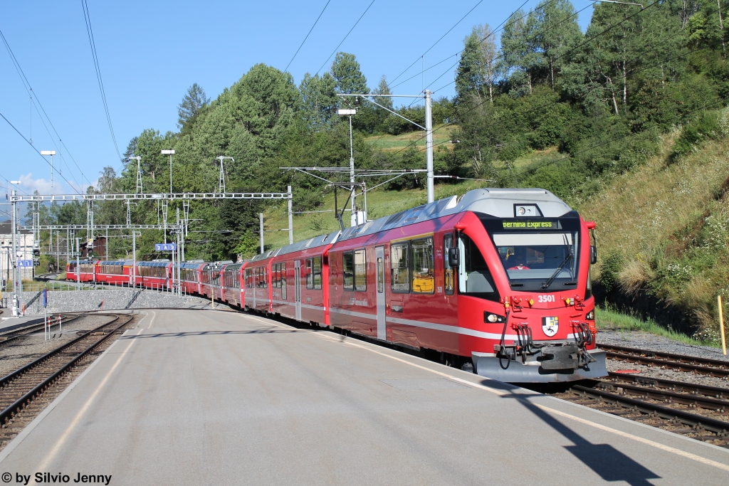 Von Davos her erreicht am 11.8.2013 der ABe 8/12 3501 ''Willem Jan Holsboer'' Filisur als BEX 961 nach Tirano.