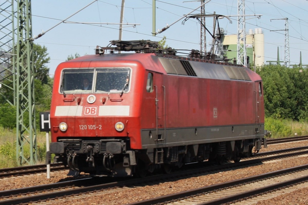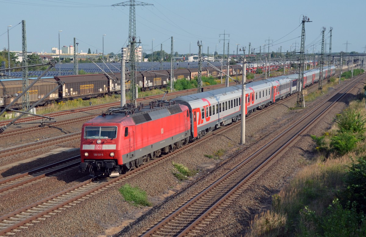 120 137 fuhr mit dem in Berlin übernommenen EN 452 Moskau-Paris am 25.08.13 durch Bitterfeld Richtung Halle(S).