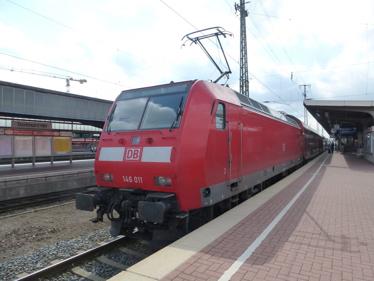 146 011 steht hier mit dem RE6 nach Düsseldorf im Dortmunder Hauptbahnhof auf Gleis 18.