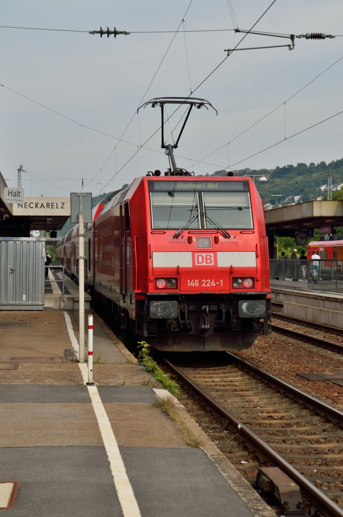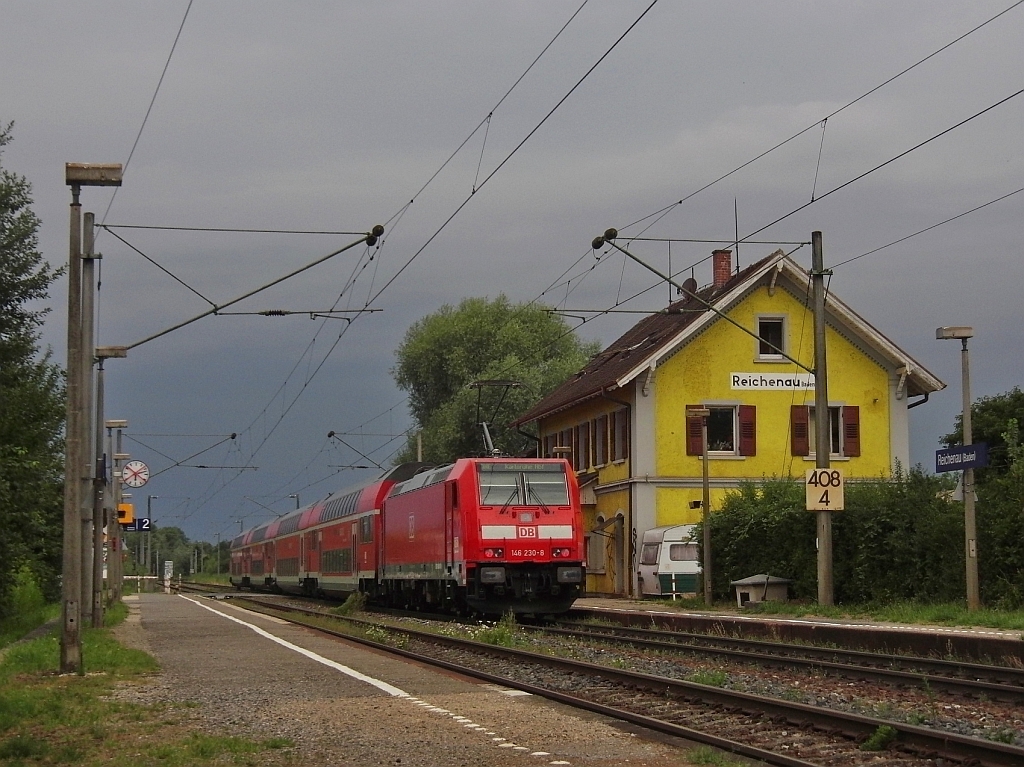 Eine viertel Stunde bevor heftiger Regen und starker Wind einsetzte, wurde am 04.08.2013 an der Haltestelle Reichenau (Baden) 146 230-8 mit IRE 5312 von Konstanz nach Karlsruhe fotografiert.