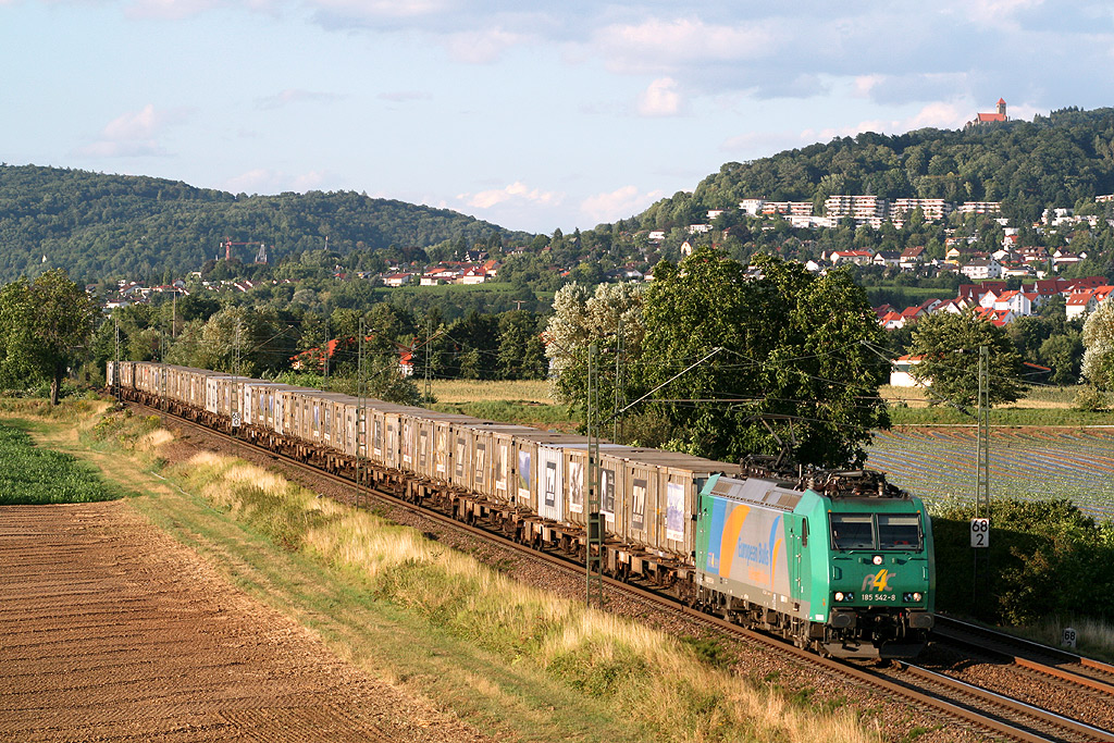 185 157 mit Containerzug am 23.08.2013 in Blumau bei Kronach Richtung Saalfeld.