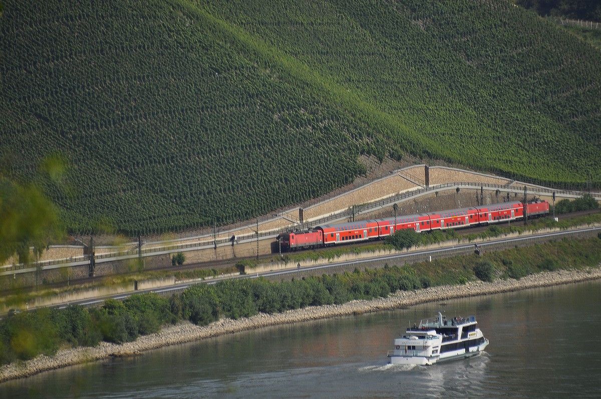 22.08.2013 Rheinschleife bei Boppard; ein RE, mit zwei 143ern im Sandwich-Betrieb gefahren, unterwegs von Koblenz nach Mainz